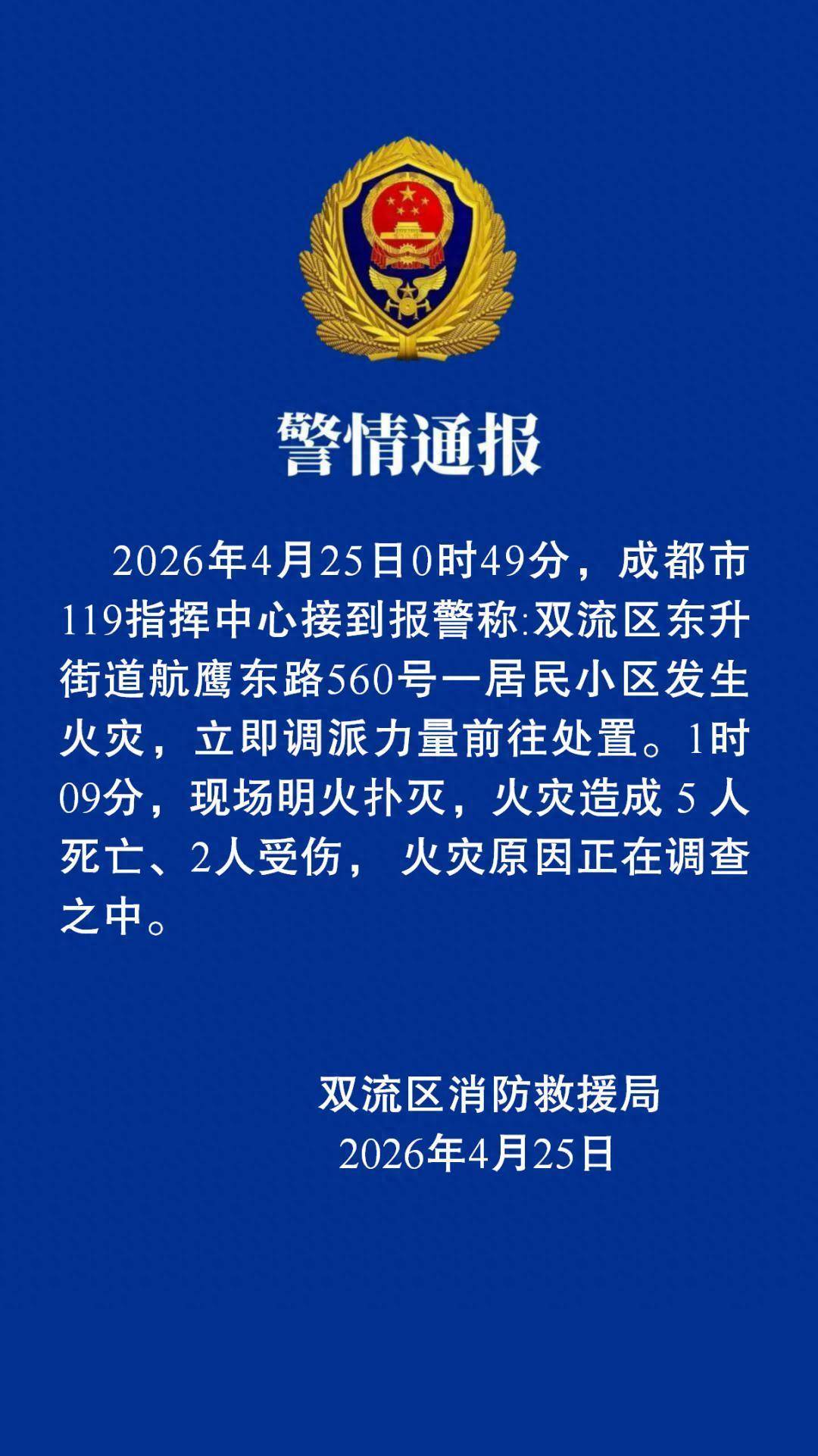2026年4月25日0时49分,成都市119指挥中心接到报警称:双流区东升街道航鹰东路560号一居民小区发生火灾,立即调派力量前往处置。1时09分,现场明火扑灭,火灾造成5人死亡、2人受伤,火灾原因正在调查之中。