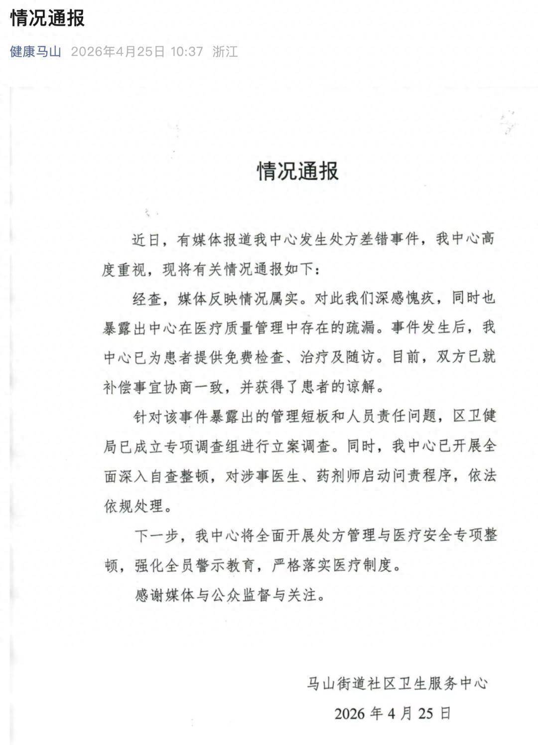 4月25日,浙江绍兴越城区马山街道社区卫生服务中心发布情况通报: